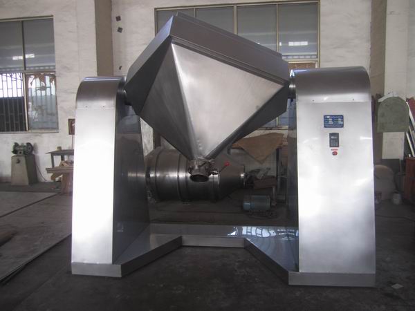将物料装入方锥形密闭混合桶内,料斗对称的轴线与回转轴轴线成一夹角,不同组分物料在密闭的料斗中进行三维空间运动,产生强烈翻转和扩散收缩作用,达到佳的混合效果。