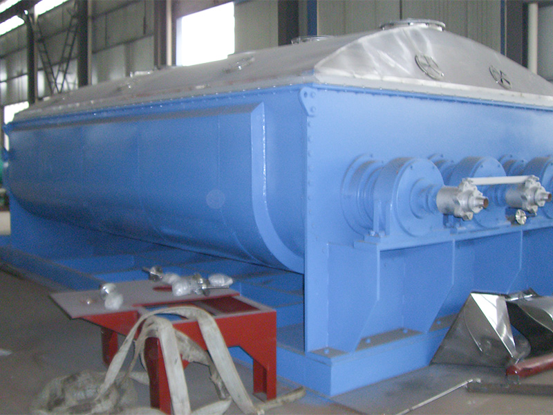 空心轴上密集排列着楔型中空浆叶,热介质经空心轴流经浆叶。单位有效容积内传热面积很大,热介质温度从-40℃到320℃,可以是水蒸汽,也可以是液体型:如热水、导热油等。间接传导加热,没有携带空气带走热量,热量均用来加热物料。热量损失仅为通过器体保温层向环境的散热。楔型浆叶传热面具有自清洁功能。物料颗粒与楔型面的相对运动产生洗刷作用,能够洗刷掉楔型面上附着物料,使运转中一直保持着清洁的传热面。浆叶干燥机的壳体为Ω型,壳体内一般安排二到四根空心搅拌轴。壳体有密封端盖与上盖,防止物料粉尘外泄而充分发挥作用。